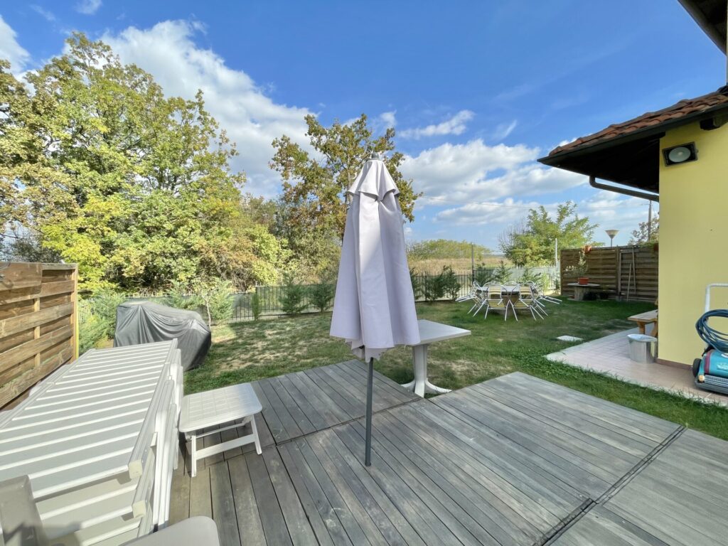 In zona tranquilla ed immersa nel verde, a pochi minuti dal centro di Nizza Monferrato, porzione di villa bifamiliare libera su tre lati.